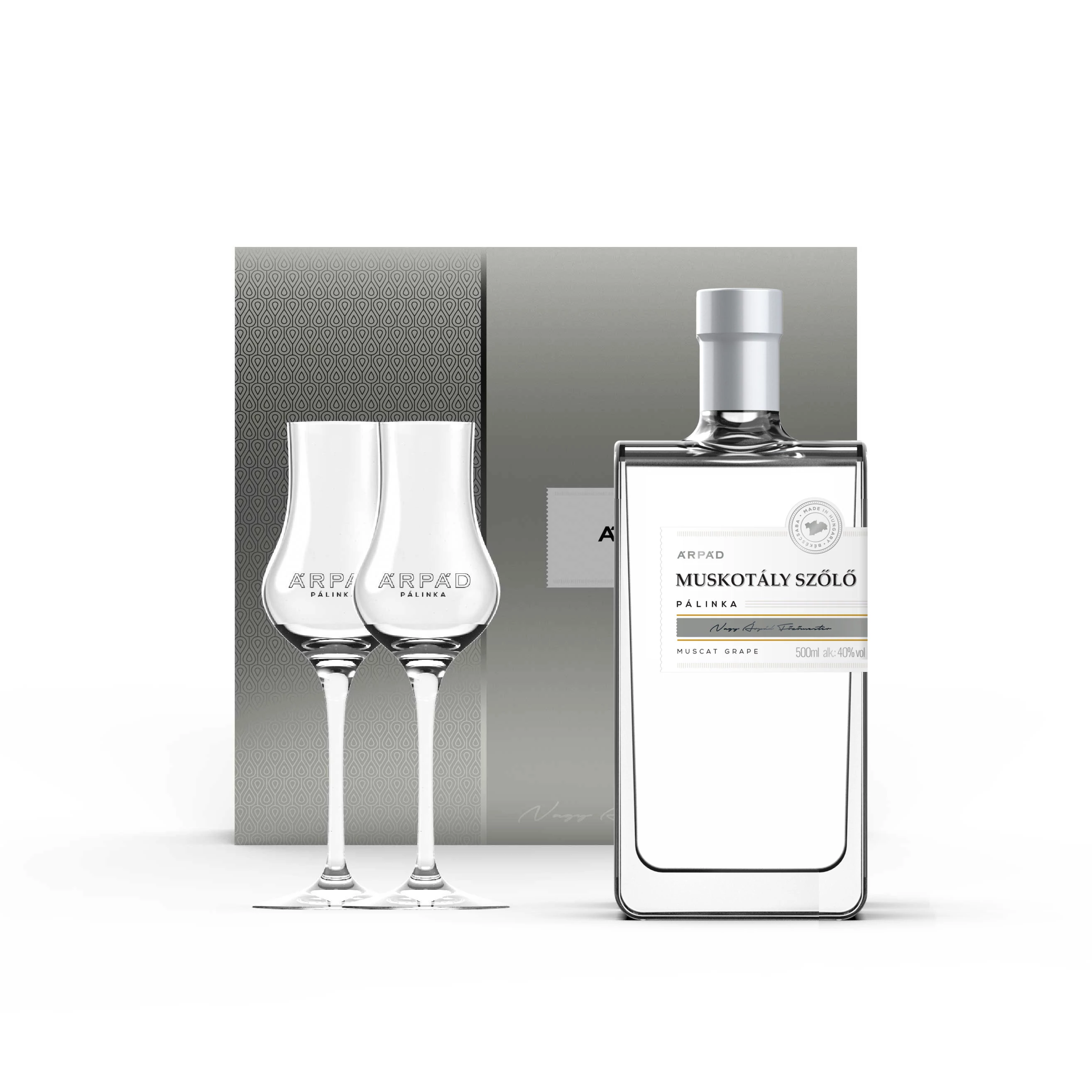 Díszdoboz: Kreatív papírból készült, ezüst színű prémium díszdoboz. A doboz tartalmaz 2 db tulipán formájú, talpas pálinkáspoharat, amely nagyon dekoratív és általa a pálinka íz és illatjegyei még jobban érvényesülnek.